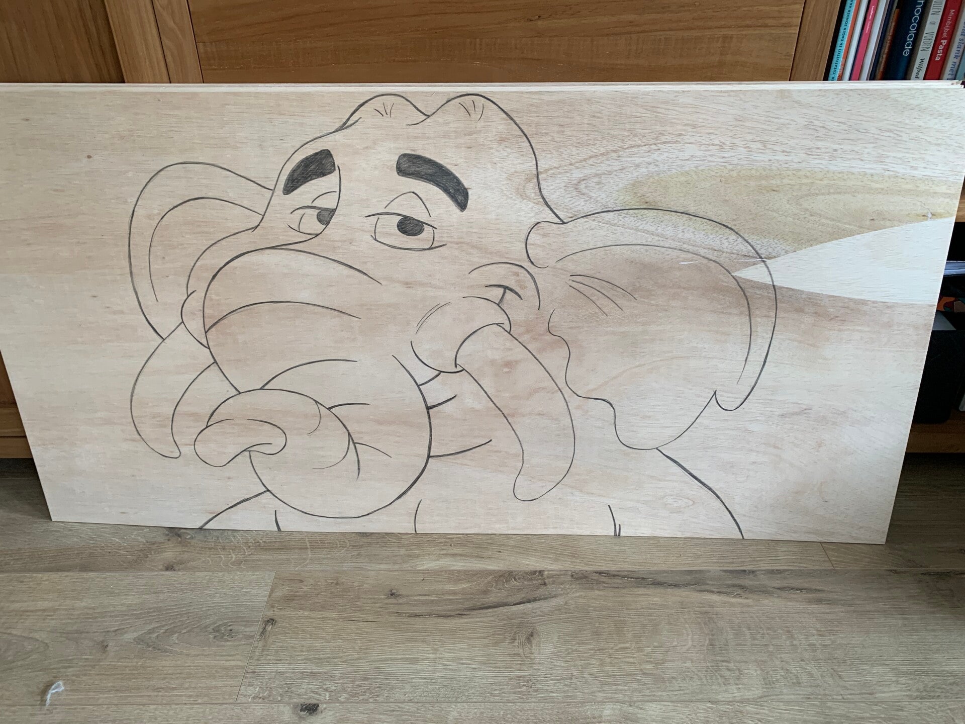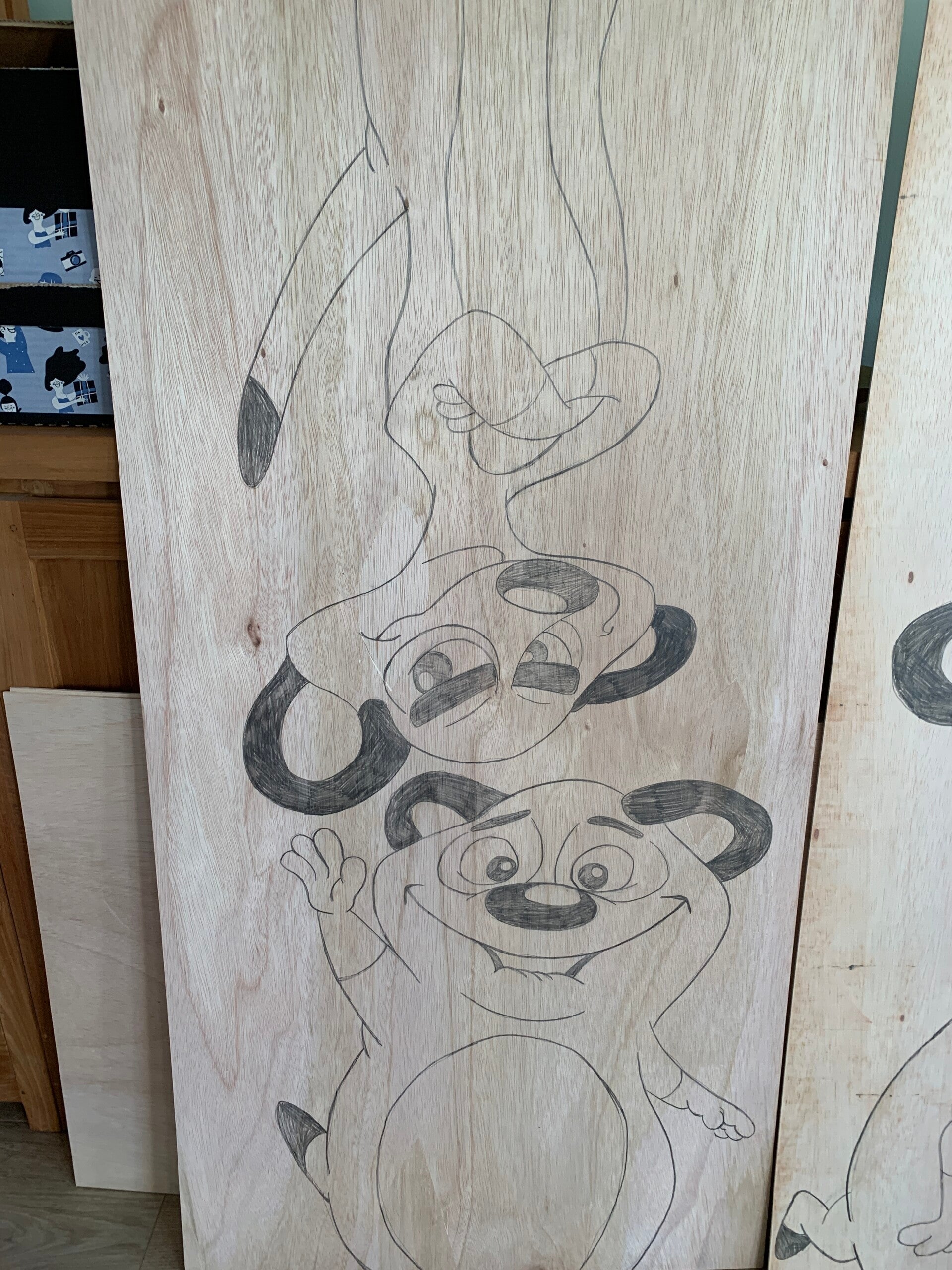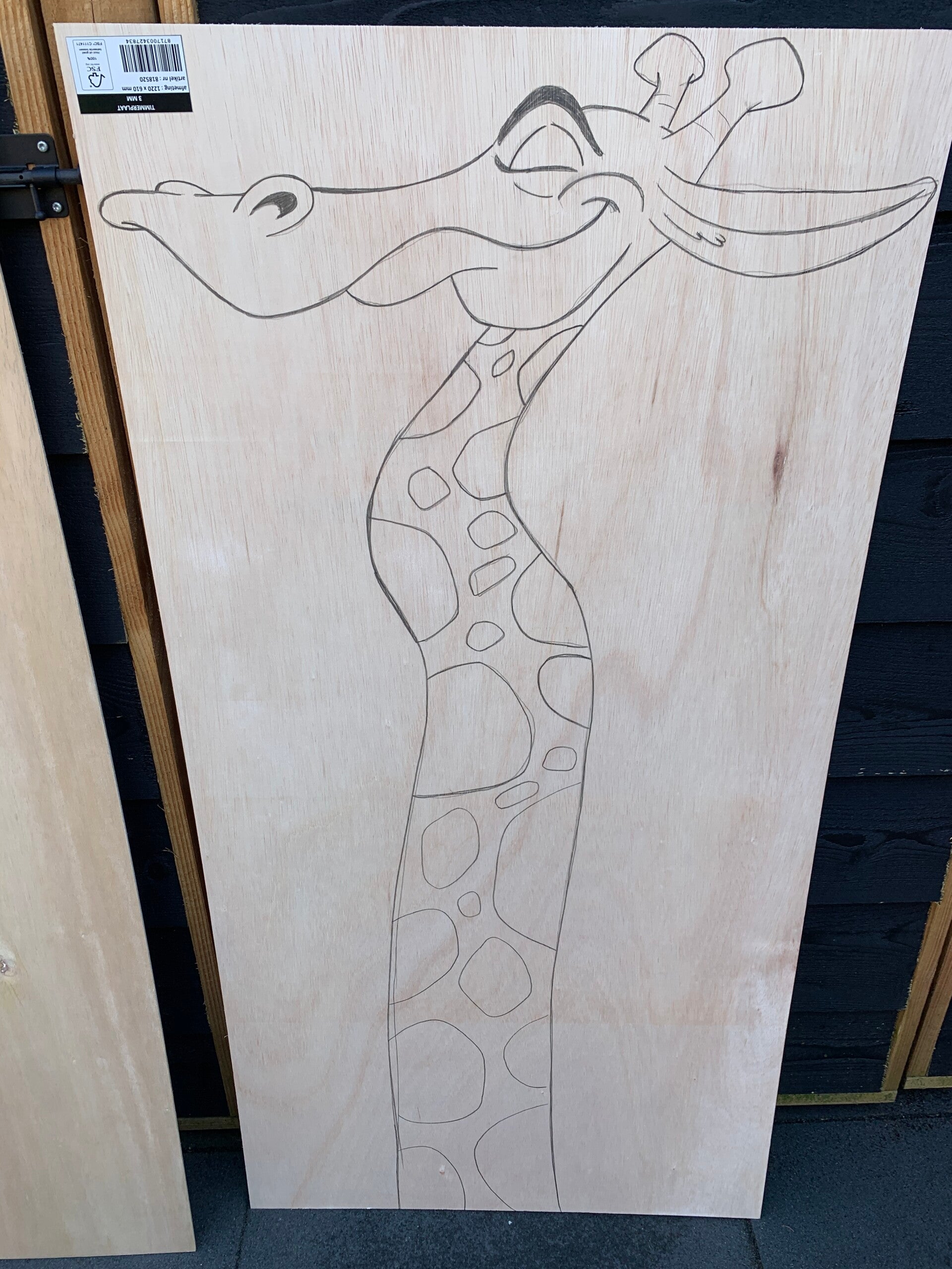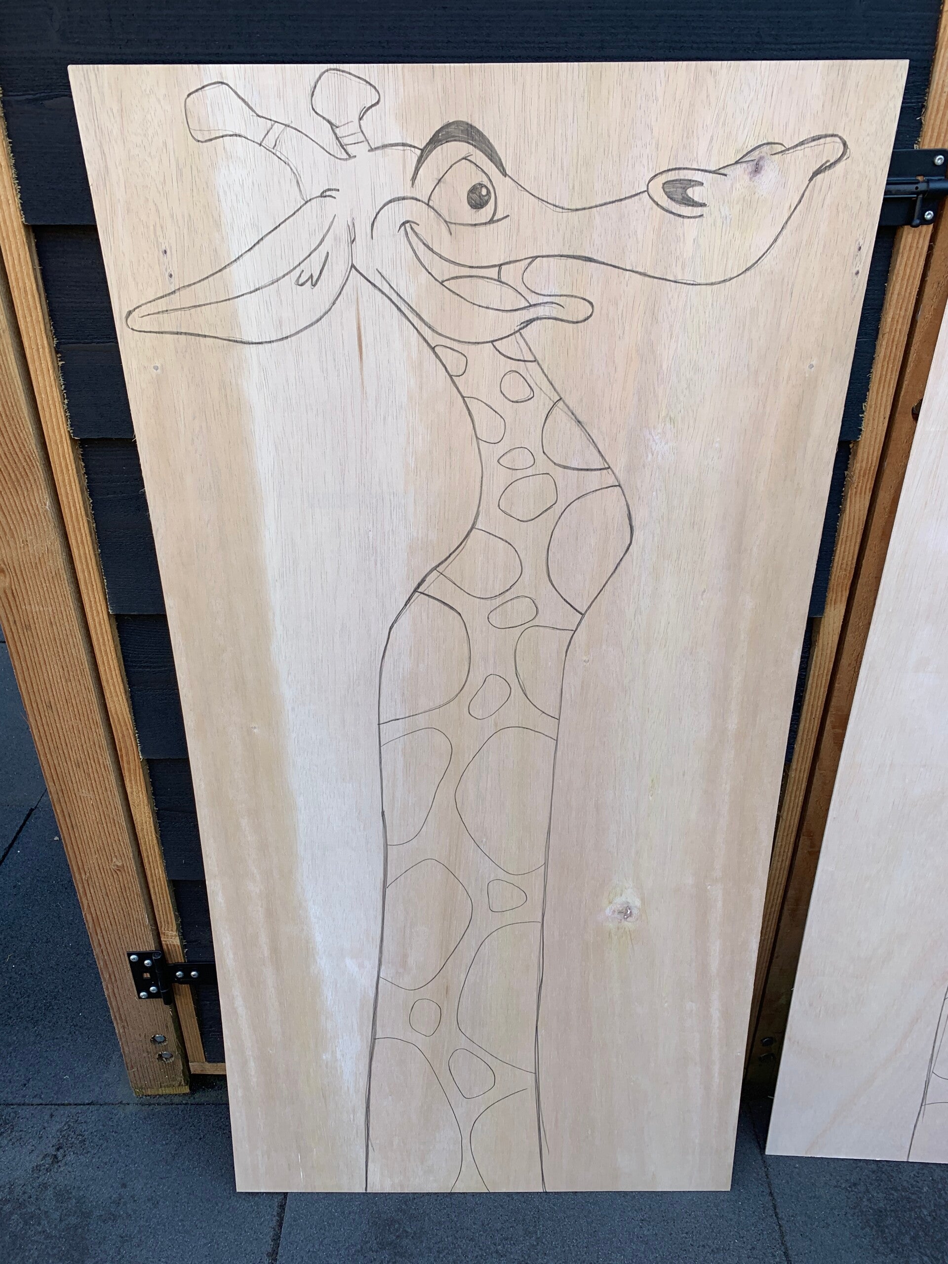 Speciaal voor deze voorstelling heb ik een aantal dierenhoofden ontworpen die een belangrijke rol spelen in het decor. Twee prachtige giraffenkoppen, een indrukwekkende olifantenkop en vier vrolijke stokstaartjes zijn inmiddels op multiplex overgebracht. Het zijn grote, opvallende figuren die straks echt gaan bijdragen aan de sfeer op het podium.